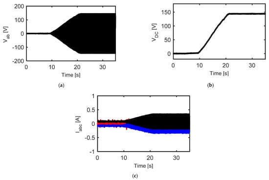 Figure 9 shows the experimental results of testing the clamping circuit at start-up without operating the PWM of the rectifier and charging using the ramp-line voltage Vab. Figure 10 describes the experimental results of testing the clamping circuit at start-up without operating the PWM of the rectifier and charging using the step-input-line voltage Vab. Hence, it is concluded from these figures that the start-up of the proposed MC should consider the following conditions: (1) the PWM of the rectifier stage should be held during the start-up until the capacitor charging finishes and (2) the capacitor charging should be done using any line voltage and this input-line voltage must be smoothly increased from zero up to the operating value.