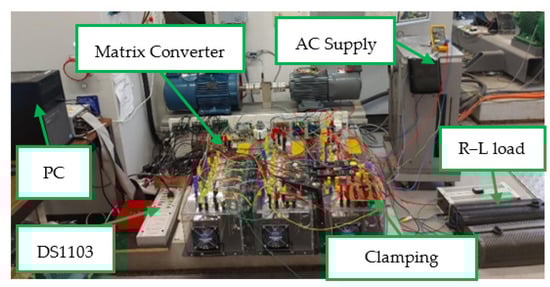 Figure 12 shows the test bench used in the experimental measurements. The MC is controlled to give different output frequencies, e.g., 100 Hz, 50 Hz and 25 Hz. Figure 13 and Figure 14 show the simulation and the experimental results for the MC at 50 Hz of output frequency, respectively. The simulation and experimental results of the DC-link voltage are shown in Figure 13a and Figure 15b, respectively. The input voltage to the MC during the experimental measurements is shown in Figure 15a. There is a great agreement between the measured and the simulated results. Figure 16 and Figure 17 show the simulation and the experimental results for the MC at 100 Hz of output frequency, respectively. Figure 18 and Figure 19 display the simulation and the experimental results for the MC at 25 Hz of output frequency, respectively.