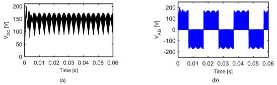 The zero-vectors are ignored during the rectifier-stage modulation with the aim of obtaining the greatest DC-link voltage. As a result, the switching sequence simply comprises the two active vectors, , whose duty cycles are , respectively, and can be defined by Equations (5) and (6) []. The average DC-link voltage in the first sector can be calculated from Equation (7). The switching states and the duty cycles for the other sectors may be determined using the same method as reported in Table 1.
