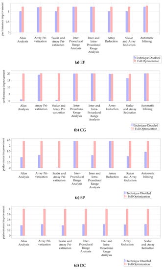 (a) Performance results for EP, (b) Performance results for CG, (c) Performance results for SP and (d) Performance results for DC benchmarks from the NAS Parallel benchmark suite v3.3 for input class B. The selected base case is the best tuned version (all on). One technique at a time is turned off, and the impact on performance is plotted (Lower bar means a higher impact of the technique).