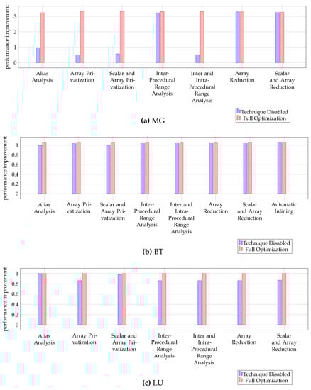(a) Performance results MG, (b) Performance results for BT and (c) Performance results for LU benchmarks from the NAS Parallel benchmark suite v3.3 for input class B. The selected base case is the best tuned version (all on). One technique at a time is turned off, and the impact on performance is plotted (Lower bar means a higher impact of the technique).