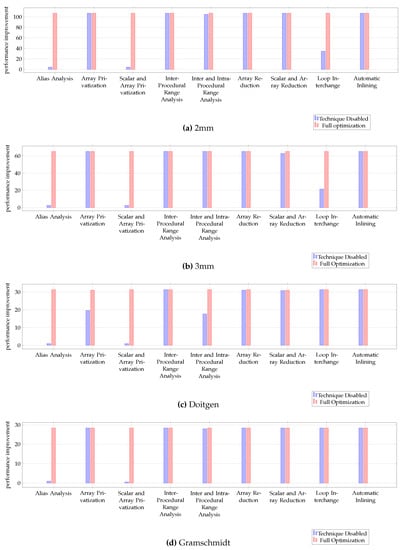 (a) Performance results for 2mm, (b) Performance results for 3mm, (c) Performance results for Doitgen and (d) Performance results for Gramschmidt benchmarks from the PolyBench benchmark suite v4.2. The selected base case is the best tuned version (all on). One technique at a time is turned off and the impact on performance is plotted (lower bar means a higher impact of the technique).