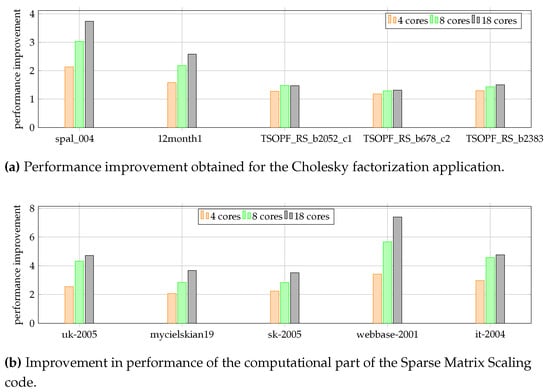 Improvement in the performance of the parallel (a) Cholesky factorization and (b) Sparse Matrix Scaling applications after applying subscripted subscript analysis.
