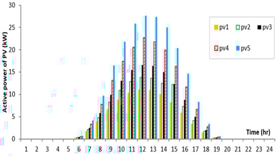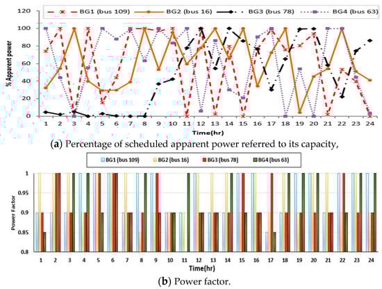 - Both BG3 and BG4 at buses 25 and 9 produce very small apparent power at the first five hours, respectively, which has the smallest loadings. Then, their output powers increase through the loading increases, whereas BG3 at bus 25 is operating with 100% of its capacity at hour 6. Added to that, BG4 at bus 9 is operating with 100% of its capacity at hours 12, 14, 17, and 18.