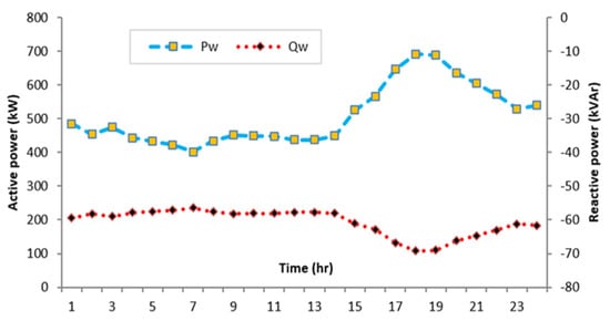 - During the other 15 h, the MG absorbs active power from the grid bus. The maximum absorbed power is reached at hour 14 with 655.4086 kW, whilst the minimum absorbed power is reached at hour 23 with 160.7345 kW.