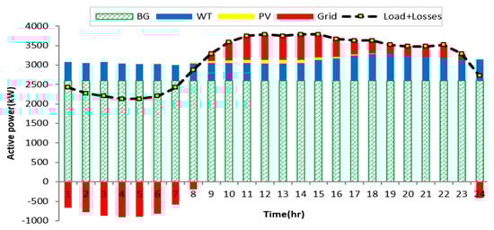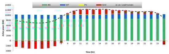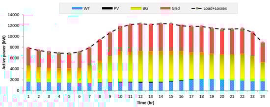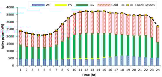 - Based on the developed EO, the hourly output powers of the PV, WTs, and BGs are optimized, as are the associated power factors of the BGs.