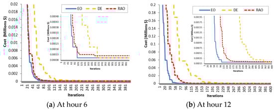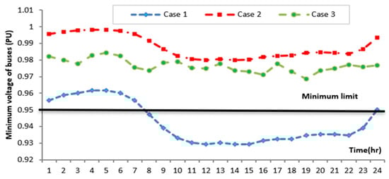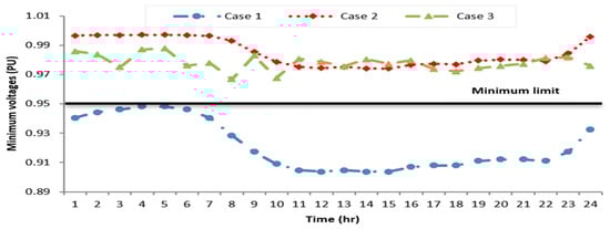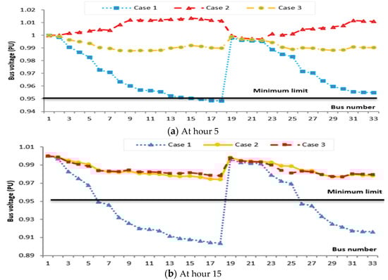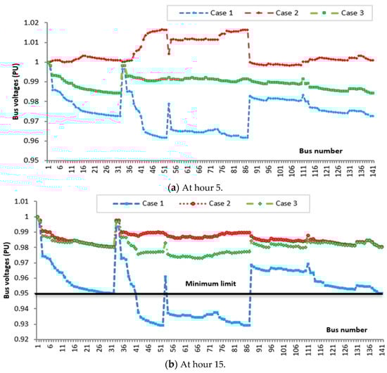 - The voltage profiles of the MG operation for every hour have been greatly improved, with the minimum voltage adjusted within the permitted limit of [0.95–1.05] p.u.
