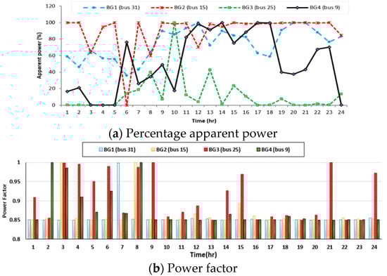 - BG3 at bus 25 is operating at a varied power factor through the day. BG4 at bus 9 is operating at a varied power factor at the first nine hours with low loading values, whilst its power factor is nearly fixed at 0.85 for the next hours.