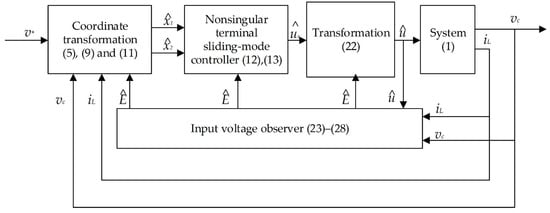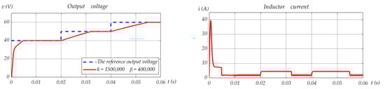In this section, the proposed controller is used to control the boost converter feeding a CPL in a MATLAB/Simulink environment, and its effectiveness is verified. The simulation schematic of the proposed controller is shown in Figure 3. From the reference [33], the parameters adopted by boost converter are shown in Table 1. The initial output of the proposed observer is selected as 9 V to imitate the case that the input voltage E is unknown. The sliding surface parameters p and q are chosen as 5 and 3, respectively.