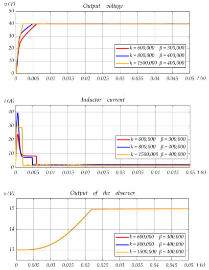 Finally, we verify the stability of the closed-loop system when there is a step change in the input voltage E. It changes from 15 V to 20 V at 0.04 s. The controller parameters are