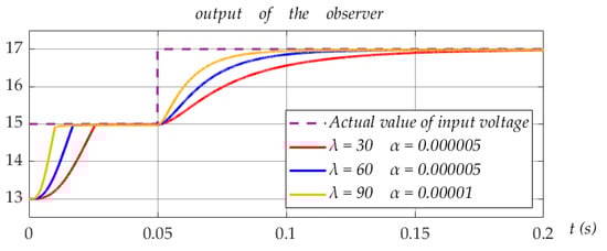 The output of the observer with different and are shown in Figure 7. We can increase the values of and appropriately to improve the tracking performance. The voltage estimates can converge to the real input voltage in finite time. After 0.05 s, the estimates still track the actual voltage in a short amount of time.