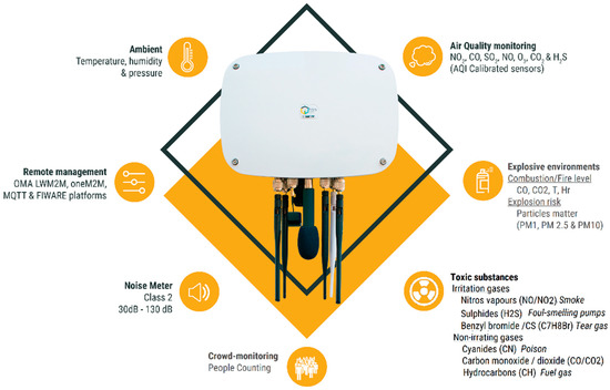 HOPU Smart Spot IoT device (HOPU Smart Spot IoT device offers Open Source libraries and framework for research purposes, smart cities and smart destination projects. Please contact: jara@hopu.org for your enqueries and check for more details: https://hopu.eu/ (accessed on 12 January 2021)).