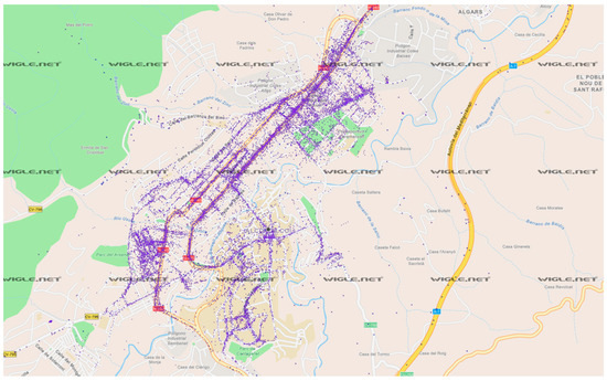 A total of 7184 unique SSIDs were captured. To contrast the captured SSIDs with the values stored in geolocation and wardriving capture services, the database was compared with the WiGLE database for the area of interest. Figure 5 shows the WiGLE map of SSIDs for the urban area of Alcoi. The purple dots on the map indicate where a particular hotspot has been detected by the WiGLE mobile application. The position of the hotspot is estimated from the GPS position of the mobile phones that have the application installed and detect the hotspot.
