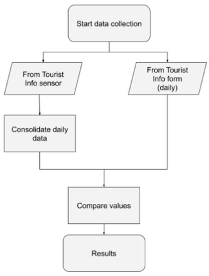 Figure 6 shows a flowchart stating how the results of our validation approach are collected. Table 1 shows the results of crowd monitoring using the HOPU Smart Spot located in the Alcoi Tourist Info office with regard to the data collected from the surveys in the same location (Table 2 summarizes results, including average accuracy). It can be observed that the total number of people detected (visitors and residents) is often overestimated with our approach. However, we have to analyse specific results detecting visitors versus residents. According to the flowchart, we compare the values coming from the detection of visitors in our proposal with those coming from the surveys carried out daily in the tourist offices. The result of this comparison can be seen in Figure 7, Figure 8 and Figure 9, where the calculation of the average accuracy is also included.