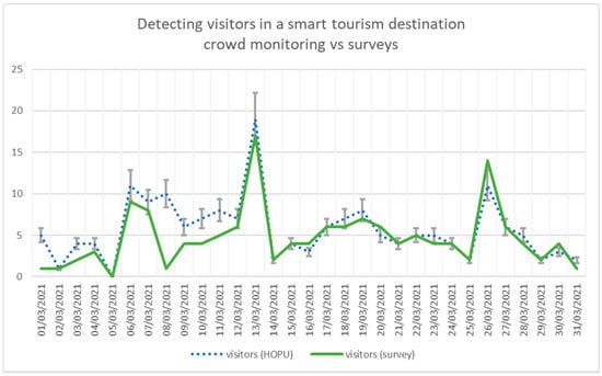 Figure 7 shows the number of visitors detected by using our approach compared to the results of the surveys. Although the number of visitors is overestimated (except from 02/03, 05/03 and 14/03), the trend is shown to be equivalent. The only day the trend is broken is 08/03. Additionally, it can be observed that Saturdays (06/03 and 13/03) are the days on which more visitors are detected (which is an obvious result for a tourist destination).