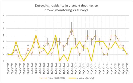 Figure 9 compares the number of visitors and the number of residents detected using both approaches (HOPU Smart Spots and surveys).