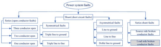 The main reasons for power supply disturbances in distribution overhead lines are series, shunt, and series shunt faults. In both utility and public safety, fault detection is a crucial concern. Earth or ground fault protection is an essential defence in electrical systems; it is necessary to preserve electrical networks and equipment. A broken conductor fault (BCF) occurs when an overhead line is interrupted and may or may not contact the ground, depending on the event’s severity. The broken conductor on the source side with high impedance fault, broken conductor on the load side with any impedance fault, or an open circuit with a conductor not touching the ground might all be responsible for the problem of undetected fault as illustrated and classified in Figure 1. The most common and dangerous type of BCF occurs when an exciting mainline drops and contacts the earth. This condition is exceptionally harmful since there is a danger of electric shock to people and a fire risk. As a result, detecting BCF is essential from human health and performance efficiency standpoints. Protective relays and circuit breakers are major components of the large interconnected power system. Substations in power distribution systems involve numerous pre-programmed protection relays with multiple stages to protect the system from many types of faults. Nevertheless, it is well known that current protection technology misses (30–50)% of BCF failures. This may lead to critical and dangerous situations that threaten the lives of citizens and animals and reduce the lifetime of the utility equipment. A broken conductor represents an open phase state on the electrical circuit in a medium voltage distribution radial system. As shown in Figure 2, BCF might be one of the following causes: (1) Open line where conductor does not touch the ground from two terminals. (2) Source side of the broken conductor with high ground resistance. (3) Load side broken conductor with any ground resistance. The load side broken conductor (LSBC) fault is a specific type of earth fault (single line to ground), which is challenging to detect since the conductor might remain suspended from the overhead line’s source-side while touching the ground from the load side. The sparks of LSBC fault create a small fault current that does not reach the pickup value of the earth fault relay, so the protection relay will not be triggered, and the medium voltage (MV) feeder remains in the CLOSE position [1]. Therefore, the LSBC faults are usually undetectable by traditional over current and earth fault protection relays as well as no response of any activated protection relay. Explaining the substation feeder setting and the pickup values of protection relays is needed to analyze the practical problem in the protection of MV distribution feeders. The ground fault is set to 10% of the overcurrent setting; this is a minimum ratio to sense the low earth fault current. When the earth fault setting value decreases, interference will occur, such as the leakage current results from the load unbalance.