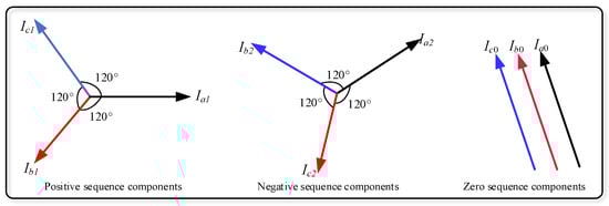 The subscripts 0, 1, and 2 indicate the zero, positive, and negative sequence components, respectively, where a = 1 ∠ 120°, a2 = 1 ∠ 240°. Equation (1) can be rewritten as Equation (2).