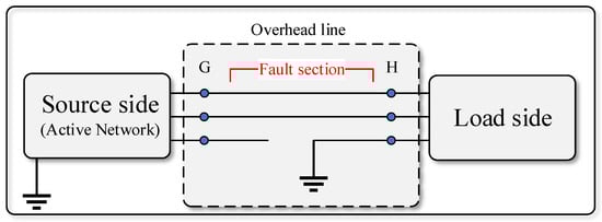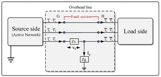 When the total conductor interruption occurs, the series impedance tends to infinity (i.e., ZS → ∞) while the conductor to ground solid contact leads follow Zg → 0. The LSBC fault study is performed by applying the SCT to the G and H sections, as shown in Figure 4, where: a, b, c, a, b, c are phase currents and phase voltages before the fault section. a, b,c, a, b, c are phase currents and phase voltages after the fault section.