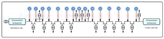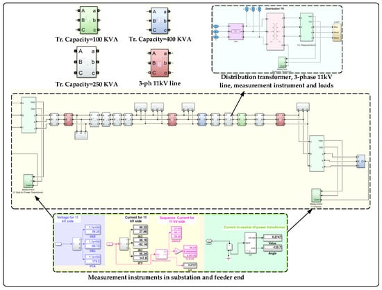 In this section, we consider the theoretical discussion. The implementation of a real network as a case study is presented. The Al-Abasia distribution substation located in the middle Euphrates region in Najaf governorate serves a large area of mixed residential, commercial, and agriculture loads and is taken as the study network. The secondary power station consists of twelve feeders, whereas the F10 feeder consists of 15 overhead transformers with a rated line to line voltage of 11 kV. The simulated circuit of the single-line diagram is presented in Figure 9. The screenshot of the MATLAB Simulink is given in Figure 10. The specification and parameters applied to this study are given in Table 1. The load of 11 distribution transformers is balanced and distributed as in Table 2.