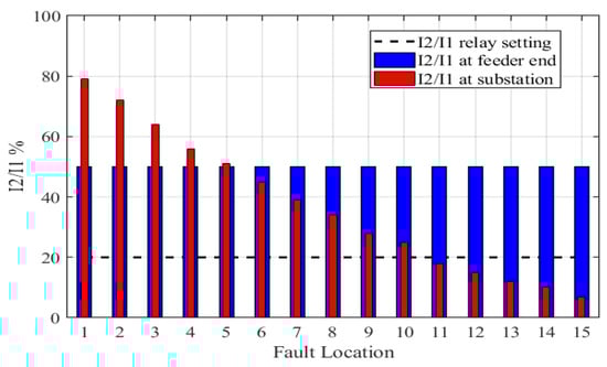 The ratio |I2/I1| was measured at two sites, first at the substation and the second at the feeder’s end. It was observed that the ratio at the substation varied between (7–79%). In comparison, it is fixed at 50% at the feeder’s end, as shown in Figure 11. The relay setting of |I2/I1| should be less than 20% [17]. In other words, the relay does not operate by less than 20%. The ratio of |I2/I1| is (7–18%) measured at the substation side for the fault site number (11–15). So, it cannot be relied upon to detect the LSBC fault, which leads us to propose another way to measure |I2/I1| at the feeder end. It is noted that the ratio of currents |I2/I1| is proven to be 50% at the end of the feeder. This ratio is for all 15 cases of faults, which is the best solution to solve the research problem. In the absence of a discontinuity, the |I2/I1| ratio is nearly constant for any variation in load demand on three phases. When a discontinuity emerges on one or more lines, the |I2/I1| ratio climbs above 20%, which is evident in a healthy line with |I2/I1| close to zero. Impedance calculations are not necessary because the positive and negative sequence impedances are identical for most residential loads, as may be concluded by looking at the ratio between I2 and I1. A comparison between the proposed method with recent literature is given in Table 5.