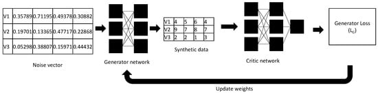 MaWGAN builds on the WGAN-GP algorithm [11,12]. Let be an i.i.d. sample from some (unknown) distribution , and let be our generator. G takes a vector of i.i.d. random variates and returns a vector with distribution say. The WGAN-GP critic calculates an estimate of the Wasserstein distance, so that the generator is trained to minimise the distance between and as measured by the Wasserstein distance.