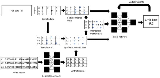 We have observations for , which we collect into an matrix X, where the i-th row of X is . Let be the mask corresponding to and let M be the matrix whose i-th row is . is our generator and our critic. Write for the weights that parameterise the generator G, and for the critic weights. It is and that we update when training G and C. The update steps require a learning rate , which we don’t explicitly include in our pseudocode.