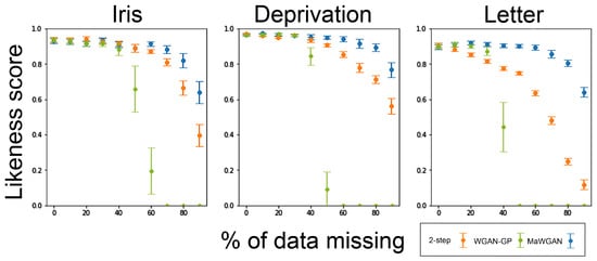 Looking at the likeness score, the results show that for these datasets MaWGAN performs consistently well with levels of missing data up to 50%. MaWGAN also performs significantly better than both the two-step method and the complete observations method with moderate to high levels of missing data, and never performed any worse than either alternative.