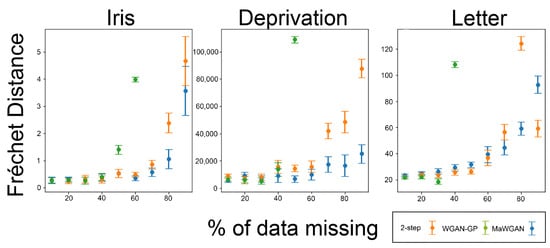 With respect to the Fréchet distance, the picture is not as one-sided, though overall, MaWGAN still performs best. All three methods give similar levels of performance with up to 30% missing data. For higher levels of missing data the complete observations method is poor, while MaWGAN usually outperforms the two-step method, but not always.