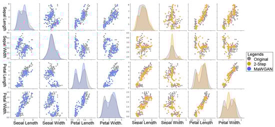 To get a better feel for the behaviour of each method, it is useful to directly compare the original data with a synthetic sample. In Figure 5, we feature the Iris dataset and use methods trained with 50% missing data. On the left, we have output from the MaWGAN, and on the right—from the two-step method. For each plot, we overlay the original data with a synthetic sample of the same size. We have four variables, and on the diagonal, we have for each a marginal density plot using a kernel smoother, and off the diagonal, we have pairs plots. Both methods have captured the location and scale of the data; however, the MaWGAN is noticeably better at picking up the bimodality.