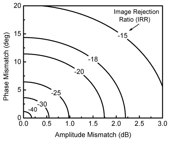 Theoretical image rejection ratio (IRR) with respect to the I/Q amplitude and phase mismatches.