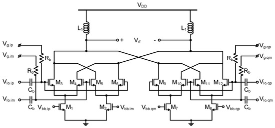Compared to the conventional methods, we present an improved I/Q amplitude mismatch calibration technique. It completely avoids the issues originating from the conventional direct-gm control at the baseband amplifier, and proves to be precise, efficient, and robust. Figure 3 shows the quadrature up-conversion mixer schematic. It is a double-balanced Gilbert-cell structure. The I-path mixer M1–6 and the Q-path mixer M7–12 perform the frequency up-conversion by mixing the I/Q-path baseband signals Vbb,i and Vbb,q and the I/Q-path LO signals Vlo,i and Vbb,q, respectively. The I/Q-path output signals are added by the load inductor L1 (210 pH), producing a single-sideband RF output Vrf. The voltage gain of the mixer is +6 dB with the total current dissipation of 12 mA. The LO signals are ac-coupled through Cb, and their gate bias voltages Vg,ip, Vg,im, Vg,qp, and Vg,qm to the switching stage FETs M3–6 and M9–12 are independently fed through the ac-blocking resistor Rb (1 kΩ).