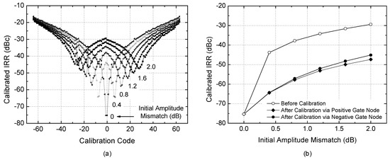 Simulated I/Q amplitude mismatch calibration. (a) IRR calibration behavior with respect to the calibration code. (b) Comparison of the calibrated and uncalibrated IRR with respect to the initial amplitude mismatch.