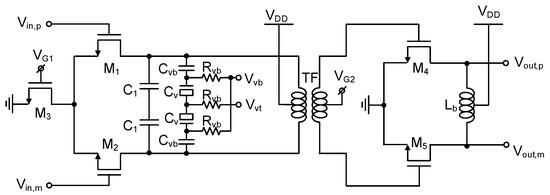 To achieve the wide and precise tunability, a MOS varactor is employed at the first-stage LC load. As can be seen in Figure 8, the load capacitor comprises a fixed capacitor C1 of 61 fF and a tunable varactor capacitor Cv of 46–77 fF. The inter-stage transformer TF is designed as a rectangular single-turn stacked structure with a dimension of 160 × 70 μm2. The two stacked layers are realized by the two top metal layers of metal 9 and 8 with thicknesses of 3.4 and 0.9 μm, respectively, and their spacing of 0.75 μm. Electromagnetic simulation verifies that the TF gives an inductance of 140 pH, a coupling factor of 0.74, a quality factor of 21, and a self-resonance frequency of 67 GHz. To obtain gradual and smooth tuning characteristics as well as a maximum tuning range, the varactor Cv is properly biased by Vvb via Cvb and Rvb. The varactor tuning voltage Vvt is generated by the same-type of the 6-bit VDAC shown in Figure 5. The full scale of the VDAC is 500–900 mV, and thus the tuning resolution of Vvt is set to 6.25 mV.