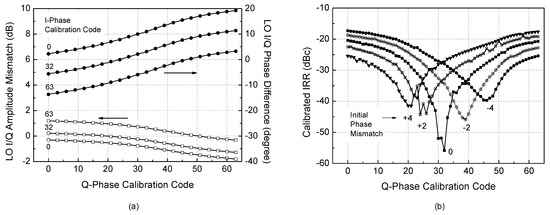 Figure 9a shows the simulated phase tuning characteristics of the phase-tunable LO buffer. It only plots three selected curves that depicts the phase difference between the I- and Q-path output signals when the calibration codes of the I- and Q-path buffers are independently swept. As can be seen, the phase difference is tunable with respect to the Q-calibration code over +2.2–+19.2 degrees, −5.6–+11.3 degrees, and −13.6–+3.2 degrees when the I-calibration code is 0, 32, and 63, respectively. Thus, the total tuning range is found to be +15.8 and +16.4 degrees for I-code and Q-code, respectively. Regarding Figure 2, we can notice that this tuning range is sufficient to achieve the calibrated IRR of better than −40 dBc. In Figure 9a, the amplitude mismatch that is induced by the phase calibration is also plotted, which is found to be about 1.5 dB. It is however considered negligible because it can be fully compensated by the accompanying amplitude mismatch calibration described previously.