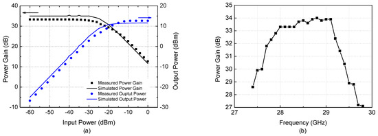 Figure 11a is the measured input-to-output power transfer characteristic at 28 GHz. The power gain of the transmitter is +33.3 dB. The output-referred 1 dB compression power OP1dB is +6.5 dBm, and the saturated output power is +12.6 dBm. The simulated and measured results show a good agreement. Figure 11b is the measured frequency response of the power gain. The peak gain is +34 dB at 28.8 GHz, and the 3-dB bandwidth is 27.5–29.3 GHz.