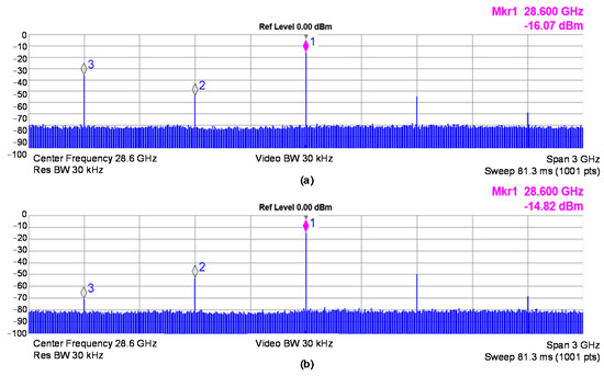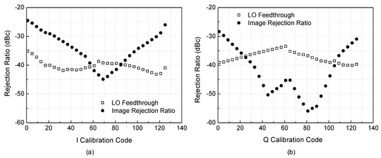 The entire calibration process for the RF transmitter includes the dc offset cancellation, I/Q phase mismatch calibration, and finally I/Q amplitude mismatch calibration. However, the dc offset and phase calibration behavior are not shown here for the sake of concise presentation, and only the I/Q amplitude mismatch calibration behavior for the IRR and LOFT is shown in Figure 13. In Figure 13a, we first fix the Q-calibration code at the middle point of 64 and sweep the I-calibration code to find the optimal IRR and LOFT performances. We find the best IRR of −44.9 dBc and LOFT of −39.2 dBc at the I-calibration code of 69. Then, in Figure 13b, we fix the I-calibration code at 69 as found before, and the Q-calibration code is swept. As a result, the best IRR and LOFT are found to be −55.9 dBc and −36.8 dBc, respectively, when the Q-calibration code is 81. Note that the best calibration codes for IRR and LOFT are not identical, so that we need to choose an arbitrary optimal point that makes the IRR and LOFT satisfactory together. In this experiment, it is found to be 69 and 81 for the I- and Q-calibration codes, respectively. The measured calibration results prove that the proposed calibration technique is effective and instrumental for the 28-GHz CMOS direct-conversion RF transmitter.