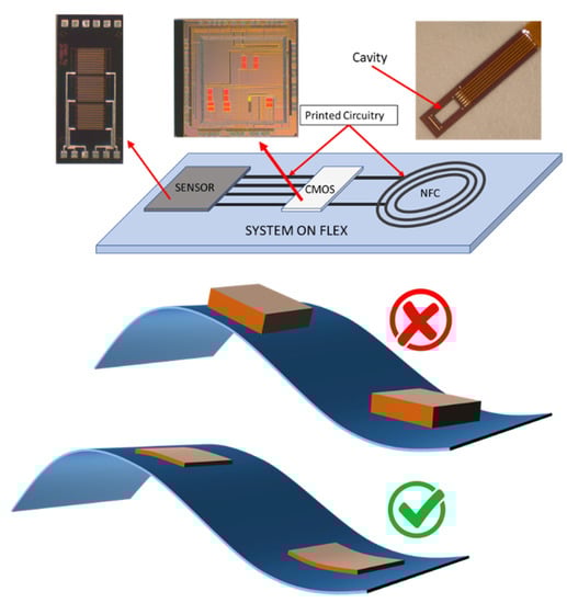Flexible and conformal systems are one of the major research areas in today’s electronics industry. If a sensor and its associated silicon-based readout electronics become flexible, the utility of the device goes far beyond the traditional applications based on rigid printed circuit boards [1,2,3]. This includes biomedical, environmental, and industrial applications. One way of doing this is to develop novel flexible materials and substrates for both transducers and electronics [4]. Though there has been quite some progress in this field [5], they are far from the abilities of modern analog and digital electronics in traditional CMOS substrates. Hence, flexible systems that can use CMOS chips provides a promising possibility. Furthermore, if the transducer can be integrated in the close vicinity of a CMOS chip (e.g., system in package (SiP) configuration), the device becomes ideal for several applications, such as patch sensors and large-area electronics. However, if it is an electrochemical sensor system exposed to a harsh environment (e.g., medical implants, water/fluid sensors), hybrid bonding, encapsulation, and packaging become critical. A reliable process that can achieve a decent yield for early stage prototyping is essential, and standard wirebonding techniques are not suitable for this purpose.