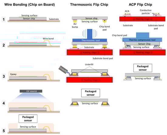 Schematic comparison among the ACP, thermosonic flip chip, and the wire bonding integration process flow to realize a sensor package with an exposed cavity. The sensing area of the chip is colored green.