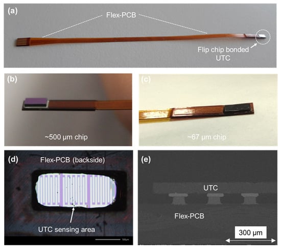 (a) Flip-chip integration of ultra-thinned chip (UTC) on flex with an exposed sensing area, (b) thick chip bonded on flex, (c) (UTC) bonded on flex, (d) exposed electrodes after bonding of UTC, and (e) SEM image of bonded UTC.
