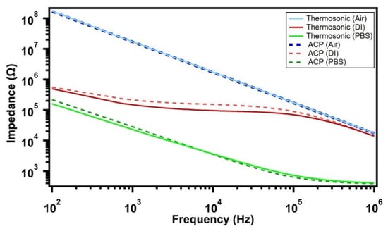 Impedance analysis of the ACP- and thermosonic-bonded samples in 3 mediums (air, Di water and PBS). The results revealed similar behavior up to 1 MHz.