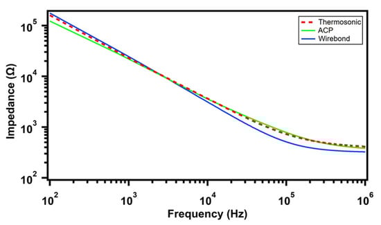 Both thermosonic-bonded and ACP-bonded sensor samples were first assessed in air and then immersed in water and phosphate-buffered saline (PBS) solution. The measurement results are plotted in Figure 6. The plots show typical characteristics of the measured impedance across a frequency range for the media used and the IDE sensor material and dimensions. It can be inferred that the impedance of the bonded samples has negligible deviation between the two bonding techniques. This trend is visible in the full frequency range from 100 Hz to 1 MHz. All the samples (three samples per kind) were functional without any faulty bonding.