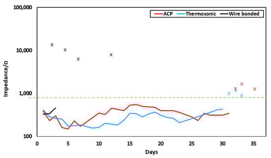 Long-term impedance variation of thinned IDE sensors far a span of days at 1 MHz, where (X) defines the failed samples.