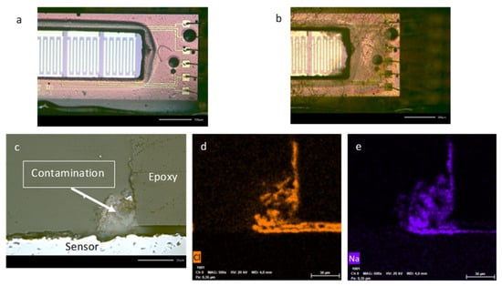 In order to understand the root cause for the early failure of wire-bonded samples, the failed samples were analyzed (Figure 9). According to the optical and SEM cross-sectional analysis, it was postulated that the diffusion of PBS/water through the encapsulating epoxy (glob-top) and contamination of the sensitive aluminum bond pads was the reason. This moisture diffusion occurs due to water traversing the epoxy network through a network of nanopores that is inherent in the epoxy structure and through microcavities [29]. By comparing Figure 9a,b, one can clearly realize the degradation of the encapsulating glob-top and emergence of microcavities. For further investigation, cross-sectional analysis was carried out. A distinctive contaminated area was detected on the wall of the epoxy as shown in Figure 9c. EDX examination was performed to investigate the material composition of the contaminant. It was revealed that the contaminant comprises sodium (Na) and chlorine (Cl), which was in agreement with the hypothesis that the PBS diffused at the epoxy interface, shown in Figure 9d,e. Moisture diffusion between the interface has previously been observed in literature by Haleh Ardebili [30] and can be an accelerator in the failure of the wire-bonded sample. The reason for the better performance of the flip-chip bonded samples was attributed to the better encapsulation of bond pads in flip-chip bonding. The lithographic and washing process to generate the cavity in the wire-bonded sample could have generated weak interfaces and caused susceptible spots in the package. Flip-chip bonded samples had a significantly small surface area in contact with the PBS compared to the epoxy in the wire-bonded sample [29]. Conclusively, it was proved that flip-chip bonded packages can prevail over conventional wire bonded samples and leverage the long-term reliability of the flexible sensor strips.