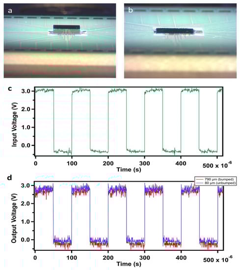 Figure 10a,b present the foundry fabricated unbumped (790 µm thick) and custom thinned unbumped (80 µm thick) CMOS chips, both ACP flip-chip bonded. Since CMOS chips are more sensitive to the induced stresses upon thinning, and bonding and pitch size were smaller than sensor chips, the functionality of the bonded thinned chips was a good indicator of the successful process flow. For the functionality test, a clock signal of 10 kHz and 3 V was applied to a digital buffer that would reproduce the input at the output. The results are shown in Figure 10c,d for both thick and thinned chips. The input signal is shown in green, while the blue (thinned) and red (original thickness) signals are the output. No functional problem was observed in any of the samples, nor did we notice any significant change in the power consumption. Hence, we can conclude that the process flow of thinning and integrating of CMOS MPW chips was successful.