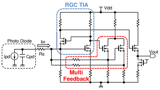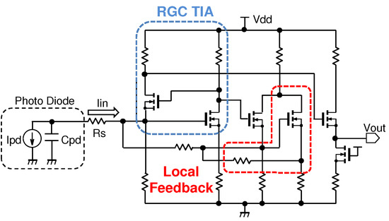 Figure 2 shows a schematic of a conventional RGC TIA based on a feedback technique [8]. The TIA is composed of the following three parts: an RGC input stage (blue dotted line in Figure 2), two feedback-gain stages (red dotted line) and a source follower output stage [10]. Because the input current of the TIA core is divided by the shunt feedback network, the input impedance can be reduced. Therefore, the bandwidth of the proposed circuit is further expanded compared with the conventional simple RGC input stage.