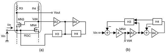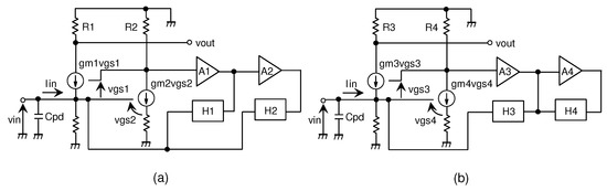 To analyze the transfer function of feedback circuit, we consider the conventional and proposed TIA transfer models as shown in Figure 4 and Figure 5, where A is the gain of common source amplifier (transistor MN or MN), – are the gains of the amplifier in the first and second feedback stage, and – are the gains of the feedback circuit.