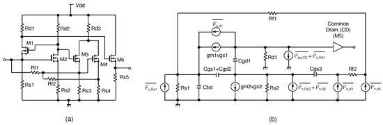 Simplified noise equivalent circuit of the proposed TIA: (a) proposed TIA circuit, (b) its equivalent noise model.