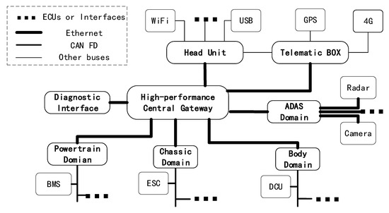 The previous researches on in-vehicle communication are mostly based on Controller Area Network (CAN) [12] and CAN FD [13] secure communication protocol. The in-vehicle network architecture is evolving, and the onboard protocol is transforming from CAN protocol to CAN FD and Ethernet protocol, as shown in Figure 1.