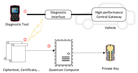 A possible attack trace for the vehicular diagnostic system, which uses classical PKC, namely RSA or ECDH algorithm, is illustrated in Figure 2. Providing a quantum computer running the Shor algorithm is available, the above diagnostic system can be deciphered. Firstly, an attacker needs a legitimate diagnostic tool. Then, with the legitimate diagnostic tool, the attacker can eavesdrop the tool’s digital certificate and the ciphertext of the Ethernet frames between this tool and the high-performance central gateway with not much effort. At last, the attacker uses the quantum computer to obtain the private key used for signing, as well as the temporary private key, which is used to derivate the session key. At this moment, the attacker can forge diagnostic tools or analyze the diagnostic frames of the OEM to do further attacks. The quantum computer is a disaster for the data asset, which is protected by ECC or RSA algorithm. Post-quantum algorithms such as NTRUEncrypt are an efficient method to resist the future threat of quantum computers.